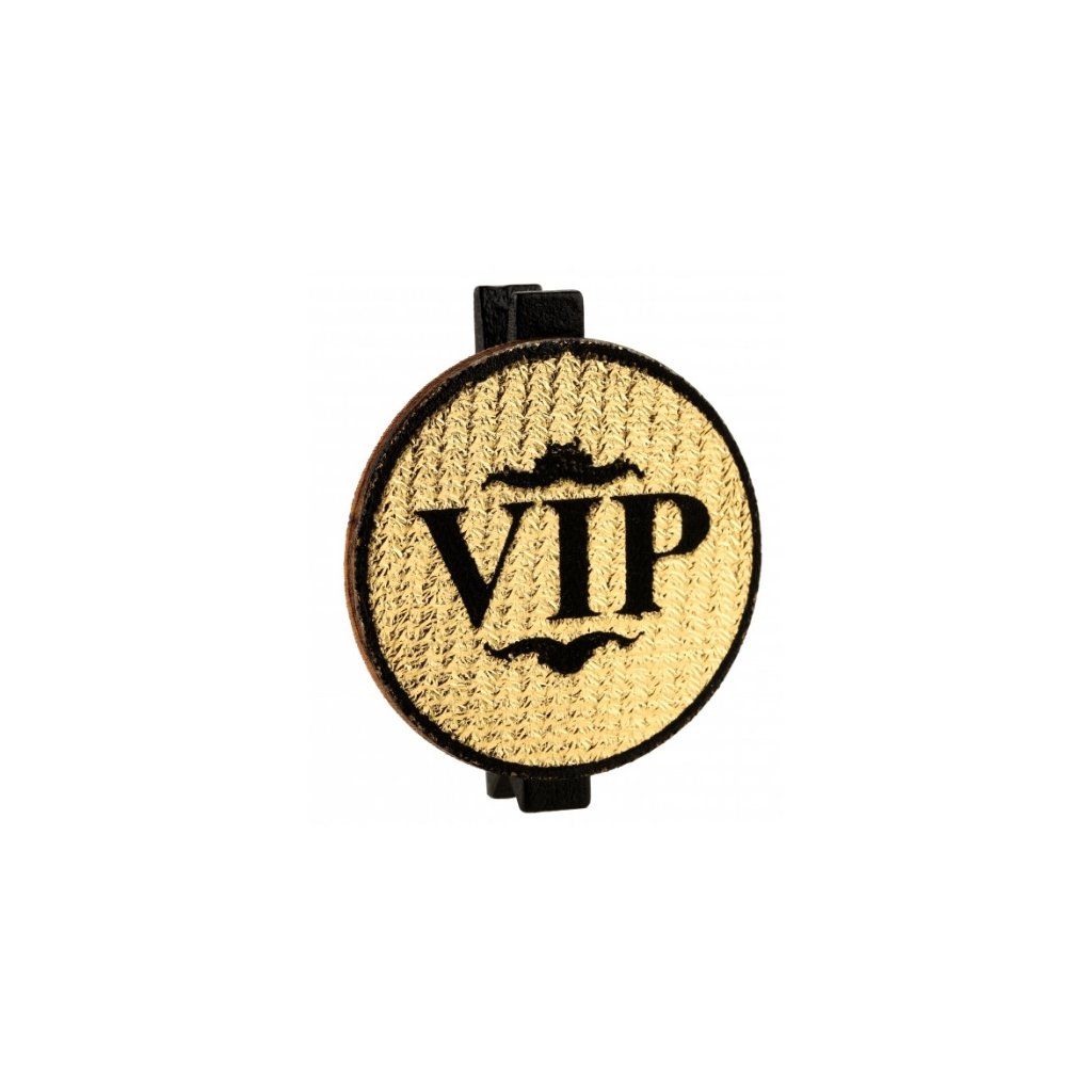 Dekorační kolíčky VIP, jsou skvělým doplňkem na vaší oslavě narozenin, rozlučce se svobodou nebo firemním večírku. Kolíček Vám ozdobí ubrousky na stole nebo sklenky vašeho šampaňského. Hodí se i jako zdobení na dárek. Velikost 4 x 5 cm Balení 6 ksDoplňkové parametry