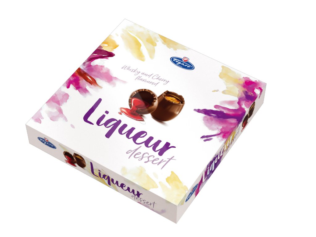 - Kolekce plněné čokolády. Hořká čokoláda (26%) s alkoholovou náplní s příchutí višní