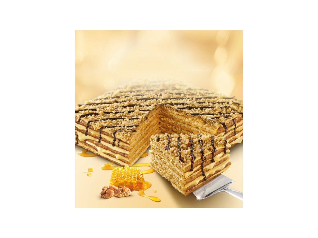 ZAHUŠTĚNÉ MLÉKO slazené s kakaem 33,3% (MLÉKO, cukr, glukózový sirup, kakaový prášek), margarín 19% [palmový tuk, plně ztužený kokosový tuk, řepkový olej, voda, jedlá sůl, emulgátor (mono- a diglyceridy mastných kyselin, slunečnicový lecitin), regulátor kyselosti (kyselina citrónová), aroma, barvivo (beta-karoten), vitaminy (A,D)], PŠENIČNÁ MOUKA 15,2%, cukr 14,3%, VAJEČNÁ MELANŽ11%, med 4,4%, OŘECHY VLAŠSKÉ 1,2%, kypřící látka (hydrogenuhličitan sodný) 0,6%, přírodní vanilkové aroma