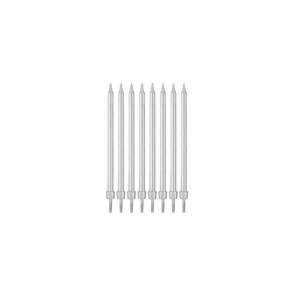 Dortové svíčky dlouhé ve stříbrné barvě s držátky pro bezproblémové upevnění na dort. Udělají radost každému oslavenci, nejen dětem. Svíčky na dort Vám ozdobí i cupcake nebo jiné zákusky jedna báseň, stačí zapojit fantazii. Nutný doplněk na vaší oslavě narozenin. Rozměr: 10 cm. Balení: 8 ks.Doplňkové parametry