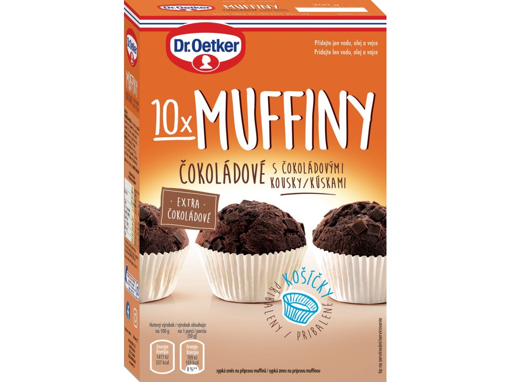 - Balení obsahuje: 300 g směsi na přípravu těsta 10 ks papírových košíčků K tomu přidáte: 110 ml vody (11 polévkových lžic) 40 ml oleje (4 polévkové lžíce) 1 vejce (velikost M) Všechny druhy trub před pečením dobře předehřejte! Elektrická trouba: 180 °C 15 - 20 min. Horkovzdušná trouba: 160 °C 15 - 20 min. Plynová trouba: střední stupeň 15 - 20 min. Při pečení respektujte zkušenosti s vlastní troubou! Příprava: 1. Na plech rozložíme 10 papírových košíčků. 2. Obsah sáčku se směsí na přípravu těsta vysypeme do mísy, přidáme vodu, olej a vejce. Metličkou nebo vařečkou vymícháme těsto dohladka. 3. Pomocí dvou polévkových lžic plníme těstem papírové košíčky, (asi do tří čtvrtin) a dáme péct. Čas a teplota pečení jsou uvedené v tabulce. Upečené muffiny necháme vychladnout a sevírujeme v papírových košíčcích. Tip: Mramorové muffiny (20 ks) Koupíme 2 x Muffiny Dr. Oetker: 1x Muffiny s čokoládovými kousky klasické (světlé). 1x Čokoládové muffiny s čokoládovými kousky. Podle návodů připravíme obě těsta. Košíčky naplníme střídavě světlým a tmavým těstem a vidličkou vytvoříme mramorový vzor. Upečeme podle tabulky.