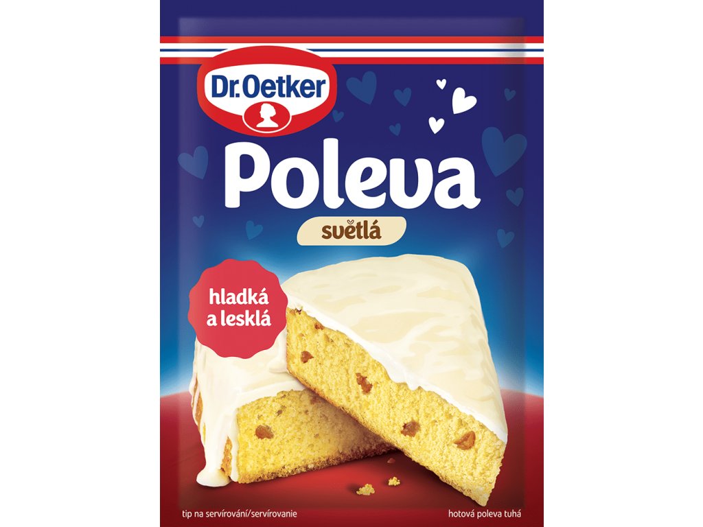 - Poleva světlá. Hotová cukrářská poleva tuhá na zdobení dortů, zákusků a jiných moučníků.