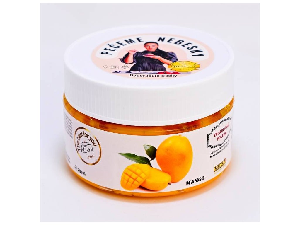Lesklá poleva pro použití za tepla i za studena. Použití: Odeberte potřebné množství farcitury z balení, nahřejte v mikrovlnné troubě nebo ve vodní lázni na 40 - 45°C a krátce promíchejte tak, aby se nevytvořily bubliny vzduchu. Poté farcituru rozetřete na zákusek pomocí špachtle. Složení: glukózovo-fruktózový sirup, voda, cukr, dextróza, modifikovaný škrob, potravinářská želatina, koncentrovaná mangová šťáva 1%, barviva (kurkuma, košenila), antioxidanty (citrát sodný, laktát vápenatý), zahušťovadla (pektin, trikalcium citrát, polyfosfát sodný), regulátor (kyselina citronová), aroma, konzervant (sorbát draselný) Nutriční hodnoty ve 100 g: energie 1077 kJ/253 kcal, tuky 0 g (z toho nasycené 0 g), sacharidy 62 g (z toho cukry 52 g), bílkoviny 1 g, sůl 0,18 gDoplňkové parametry