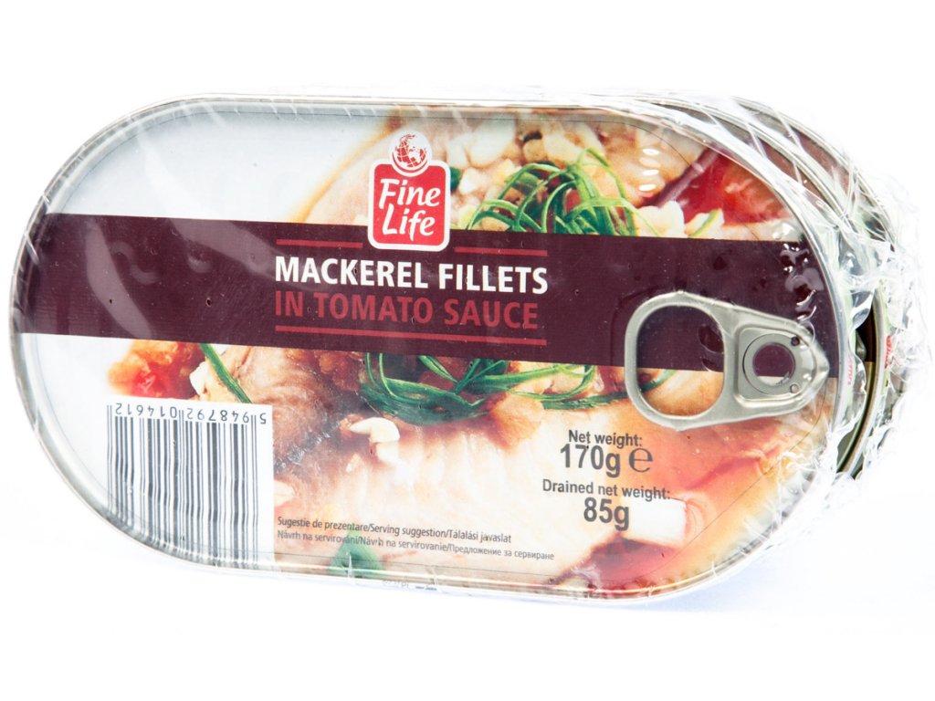 - Filety z makrely v rajčatové omáčce. Sterilovaná rybí konzerva.