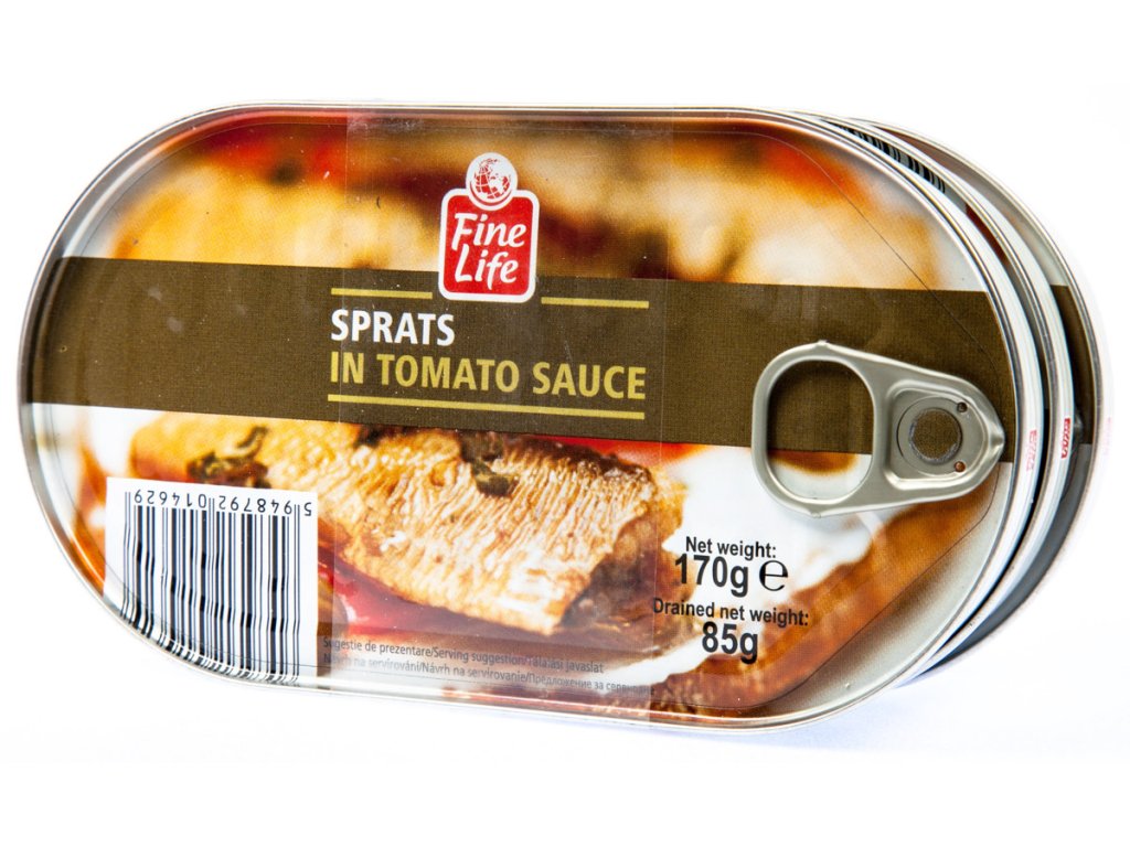 - Šproty v rajčatové omáčce. Sterilovaná rybí konzerva.