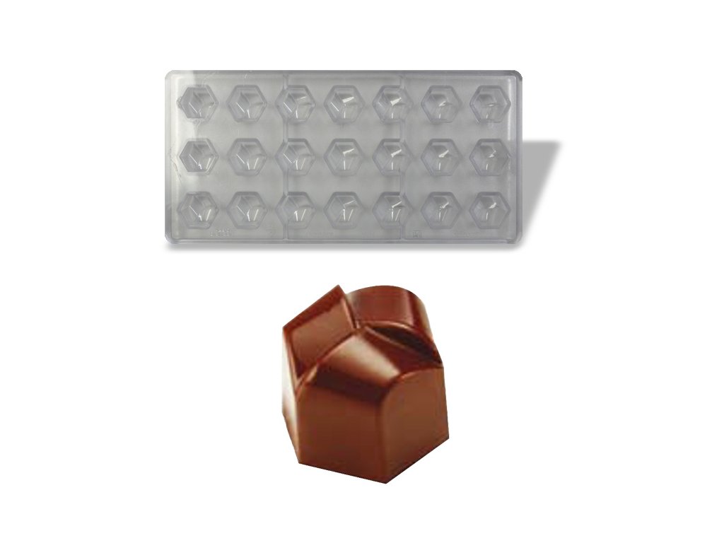 Pevná obdélníková polykarbonátová forma 3x7 tvarů na výrobu čokoládových pralinek.
