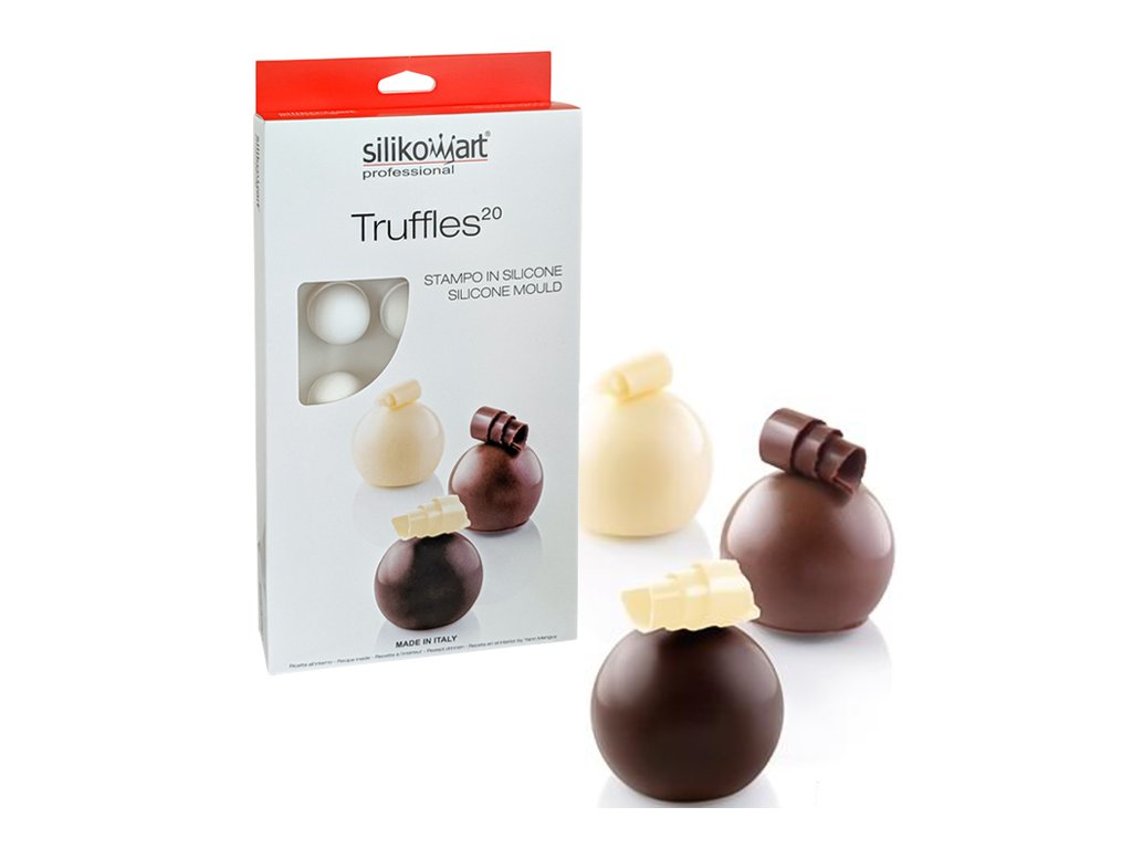 Profesionální silikonová forma k výrobě dokonalých, překrásných mini lanýžů. Forma umožňuje vytvořit 15 porcí, každá o objemu 20 ml, které mohou být dále dokončeny posypáním kakaem či glazovány. Každá forma je opatřena speciálním, inovativním okrajem na vrchní části každé dutiny, který zajistí originální zakulacení základny výrobku a snadnější vyjmutí výrobku z formy. Formu lze použít ve sladké i slané kuchyni, v troubě, šokeru, mikrovlnné troubě, v rozsahu teplot od -60°C do +230°C. Lze ji mýt ručně nebo v myčce na nádobí. Pro vytvoření úžasného efektu při rozkrojení doporučujeme kombinovat se silikonovou formou TRUFFLES120, pro kterou poslouží TRUFFLES20 jako vložka a zaručí originální vzhled výsledného výrobku. Před použitím opláchněte formu ve vodě.