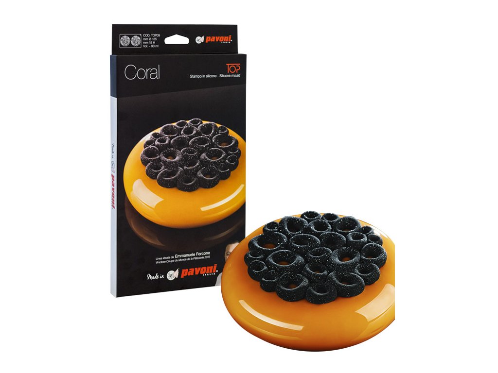 Pružná silikonová forma ve tvaru spletitých korálů na výrobu dortíků z nové série TOP od cukrářského mistra světa 2015, Emmanuele Forcone, k použití spolu s formou KE024, jako základ.