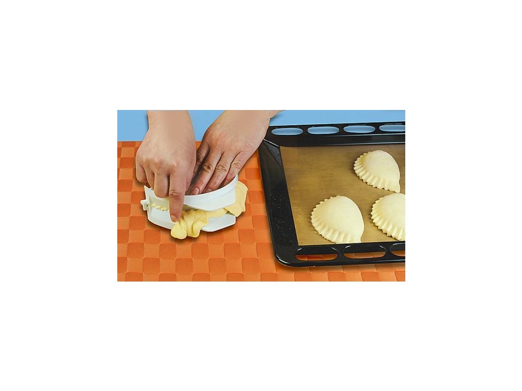 Těsto rozválíme na plát o síle 3 - 4 mm. Spodní hranou formičky z těsta vykrojíme kolečko, které položíme na opačnou stranu formičky se zubatým okrajem a do středu vložíme náplň. Vytvarování provedeme sklopením půlkruhů tvořítka proti sobě, mírným tlakem uzavřeme a vytlačené těsto setřeme prstem. Po rozevření tvořítka výrobek vyjmeme a umístíme na pečící fólii
