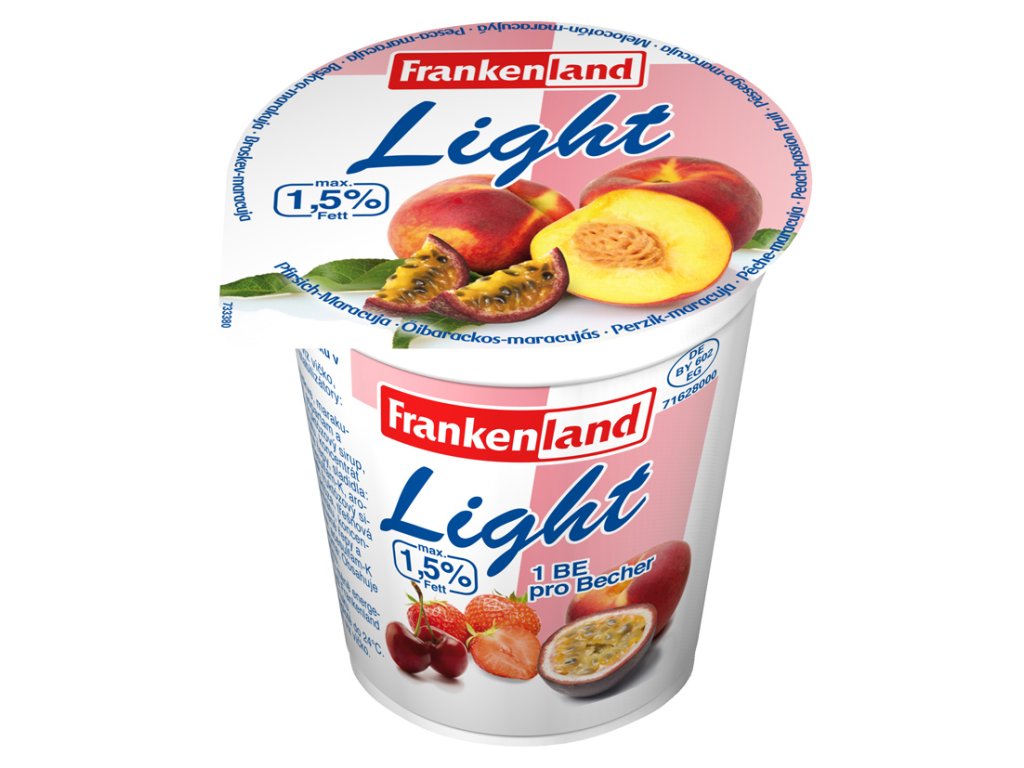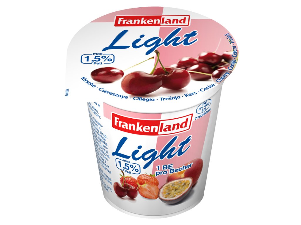 - Jogurtový výrobek s cukrem a se sladidly s 5% ovocné složky, 1,5% tuku v mléčném podílu, se sníženým obsahem energie. Složení: JOGURT, *ovocná složka - druh viz víčko, modifikovaný škrob, jedlá hovězí želatina, stabilizátory: karubin a pektiny. *Broskvová složka: fruktózový sirup, broskve, marakujová šťáva z koncentrátu, sladidla: aspartam a acesulfam-K, aroma;*jahodová složka: (fruktózový sirup, jahody, jahodová šťáva z koncentrátu, koncentrát šťávy z červené řepy, sladidla: aspartam a acesulfam-K, aroma);*třešňová složka: (fruktózový sirup, třešně, fruktóza, třešňová šťáva z koncentrátu, koncentrát šťávy z červené řepy a mrkve, sladidla: acesulfam-K a aspartam, aroma. Obsahuje zdroj fenylalaninu. Obsahuje o 30% méně energie než Frankenland Top jogurt 3,5% tuku.