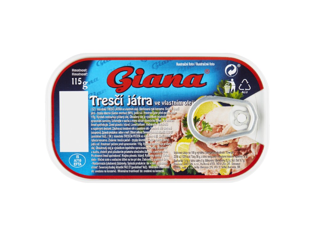 NUTRIČNÍ HODNOTY produktu - Giana Tresčí játra v oleji 115 g / 100g výrobku