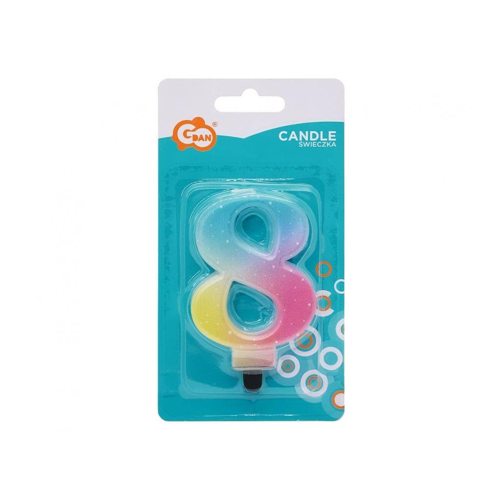 Godan svíčka žluto-růžovo-modrá číslo 8 ▹