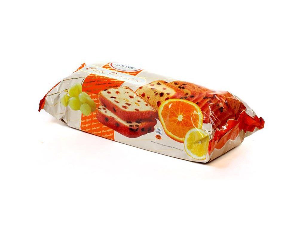 - cukr, PŠENIČNÁ mouka, řepkový olej, VEJCE, rozinky 9 %, zvlhčující látky: sorbitol, glycerol; proslazená pomerančová kůra 2 % (pomerančová kůra 57 %, glukózo-fruktózový sirup, cukr, regulátor kyselosti: kyselina citronová), glukózový sirup, PŠENIČNÝ škrob, kypřící látky: difosforečnany, uhličitany sodné, regulátor kyselosti: octany sodné, emulgátor: mono a diglyceridy mastných kyselin, kukuřičný škrob, zahušťovadlo: xantan, jedlá sůl, aroma, SÓJOVÁ mouka.