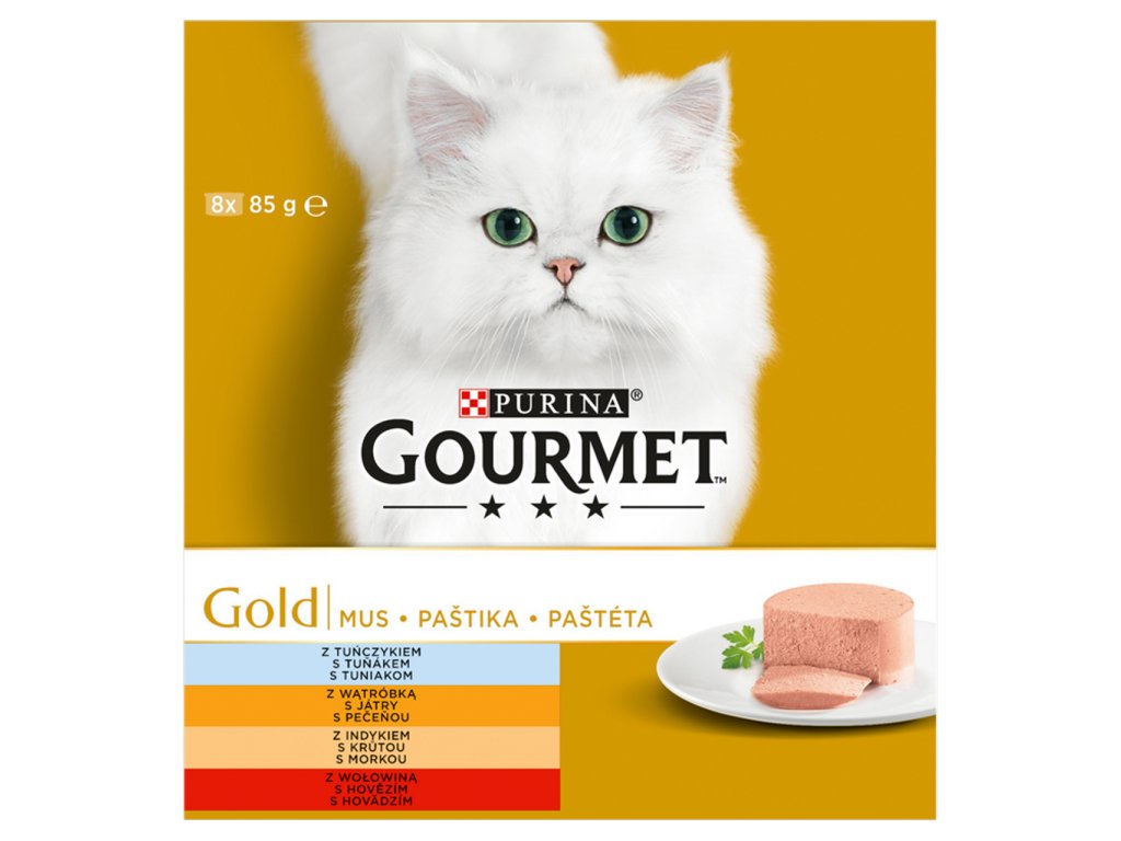- Gourmet Gold konzervy pro kočky tuňák, játra, krůta, hovězí paštika 8x85 g