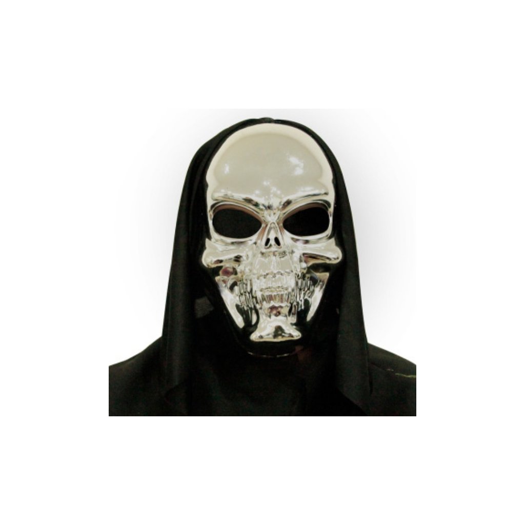 Stříbrná maska ve tvaru lebky upevněná na pružném pásku. Skvěle působí v kombinaci s černým pláštěm s kapucí. Vhodná na halloween nebo jakoukoliv party v kostýmech. Balení: 1 ksMateriál: PlastBarva: StříbrnáVelikost: DospělíDoplňkové parametry