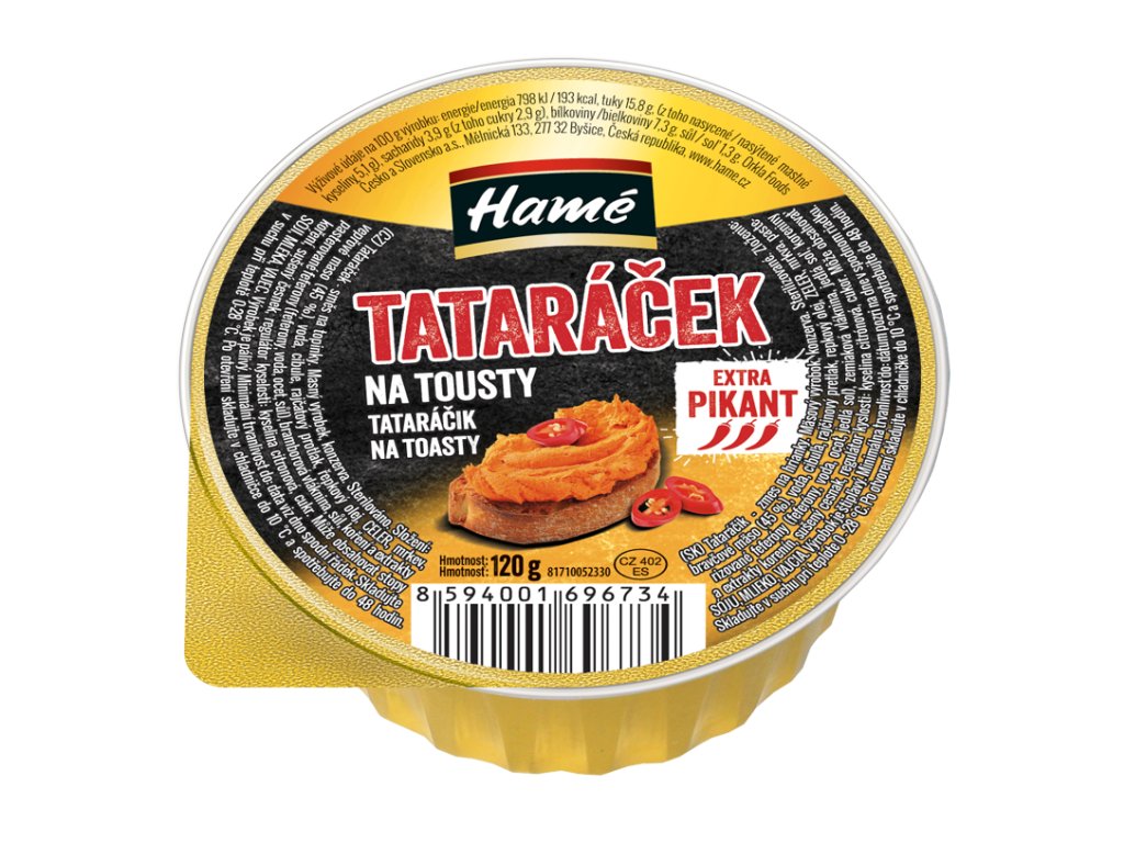 Nakupovat potraviny, drogerii a další potřeby pro domácnost online se vyplatí. Náš online supermarket Terunka.cz, toho má v kategorii: mnohem více. Prohlédněte si celou naší nabídku a ušetřete svůj čas i peníze.Hamé Tataráček na tousty 120 g za skvělou cenu, máme skladem.