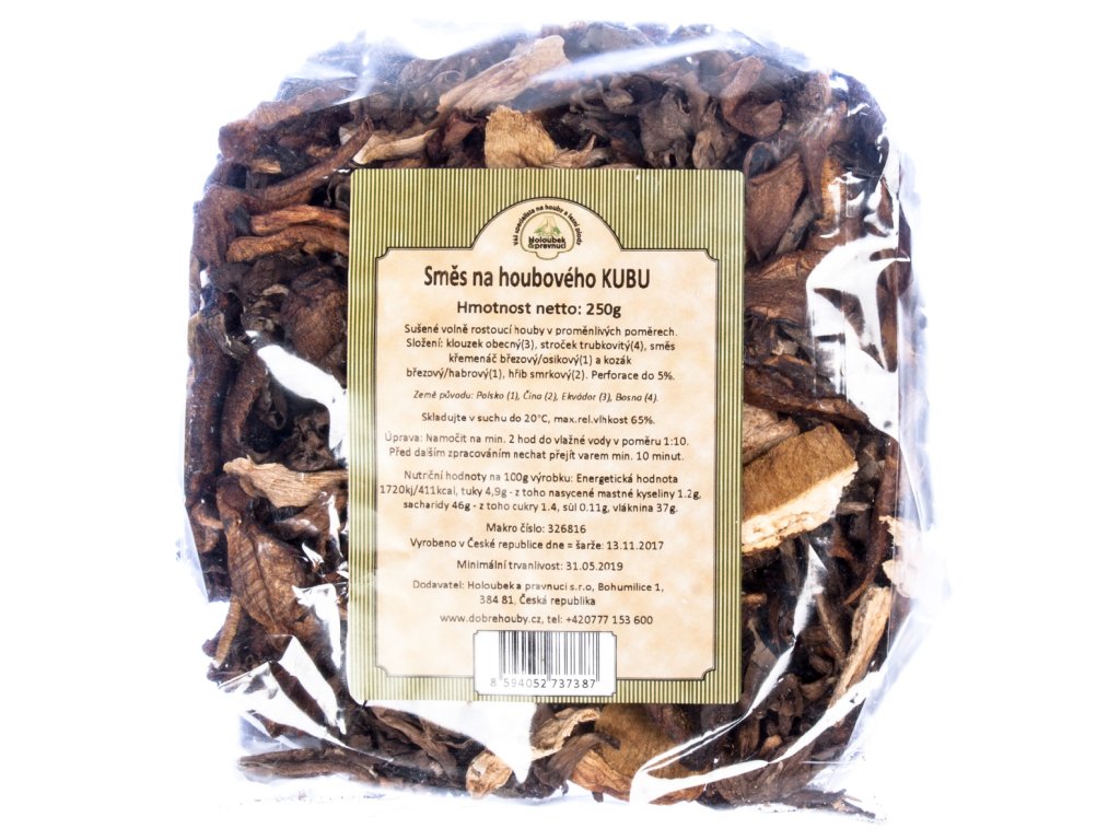 - Směs sušených hub v různém poměru: Klouzek obecný, Stroček trubkovitý, Hřib smrkový, Kozák březový/habrový, Křemenáč březový/osikový