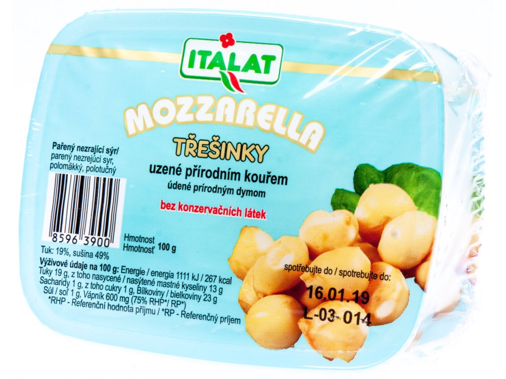 - "Mozzarella třešinky uzené 100 g- vyrobeny tradiční technologií, z čerstvého mléka a pouze s živými mléčnými kulturami, bez konzervačních látek. Uzená přírodním kouřem (dřevem)"