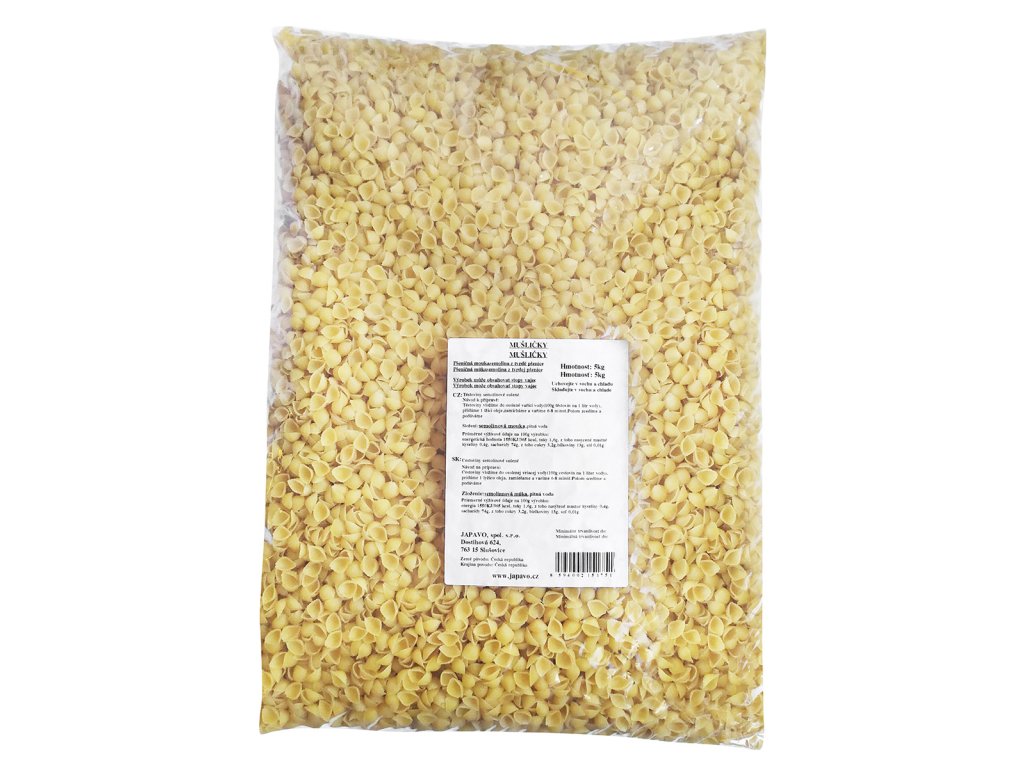 Nakupovat potraviny, drogerii a další potřeby pro domácnost online se vyplatí. Náš online supermarket Terunka.cz, toho má v kategorii: mnohem více. Prohlédněte si celou naší nabídku a ušetřete svůj čas i peníze.JAPAVO Těstoviny mušličky semolinové 5 kg za skvělou cenu, máme skladem.
