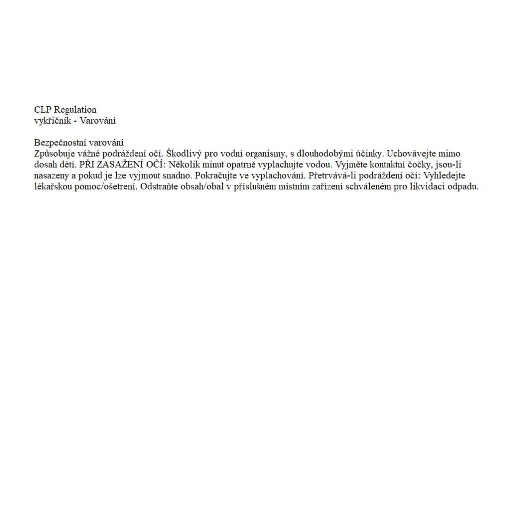 | Upozornění o nebezpečnosti: | Varování: Způsobuje vážné podráždění očí. Uchovávejte mimo dosah dětí. PŘI ZASAŽENÍ OČÍ: Několik minut opatrně vyplachujte vodou. Vyjměte kontaktní čočky, jsou-li nasazeny. Pokračujte ve vyplachování. Je-li nutná lékařská pomoc, mějte po ruce obal nebo štítek výrobku. Přetrvává-li podráždění očí: Vyhledejte lékařskou pomoc/ošetření. |