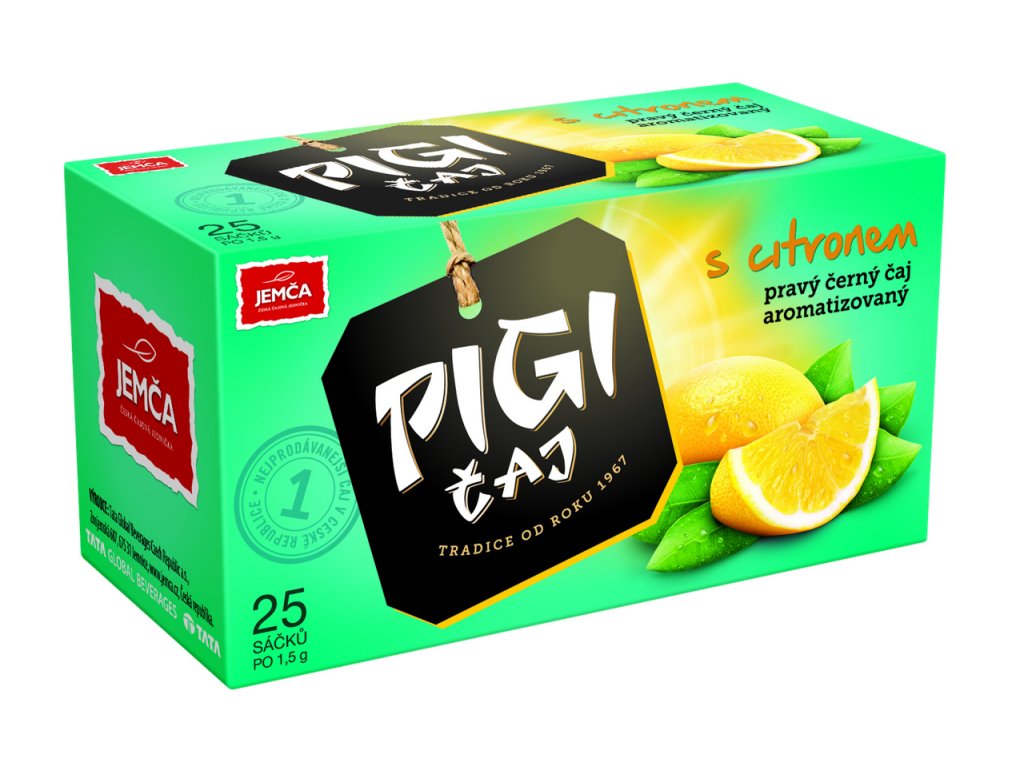 - Pigi čaj s citronem 37,5g, pravý černý čaj aromatizovaný (porcovaný v nálevových sáčcích)
