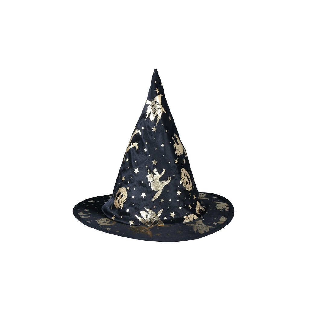 Čarodějnický klobouk v černé barvě se zlatým potiskem je dokonalým doplňkem pro Halloween, karnevalové kostýmy nebo tematické párty. Díky výraznému designu se zlatými motivy koček, hvězd a čarodějnic působí efektně a okamžitě upoutá pozornost. Klobouk je lehký, pohodlný na nošení a snadno se kombinuje s čarodějnickými šaty, pláštěm nebo make-upem. Skvěle se hodí pro děti i dospělé, kteří chtějí svému kostýmu dodat ten pravý kouzelný nádech. Rozměry: univerzální velikost (výška cca 35 cm, průměr okraje cca 38 cm)Materiál: TextilBarva: Černá se zlatým potiskemBalení: 1 ksDoplňkové parametry