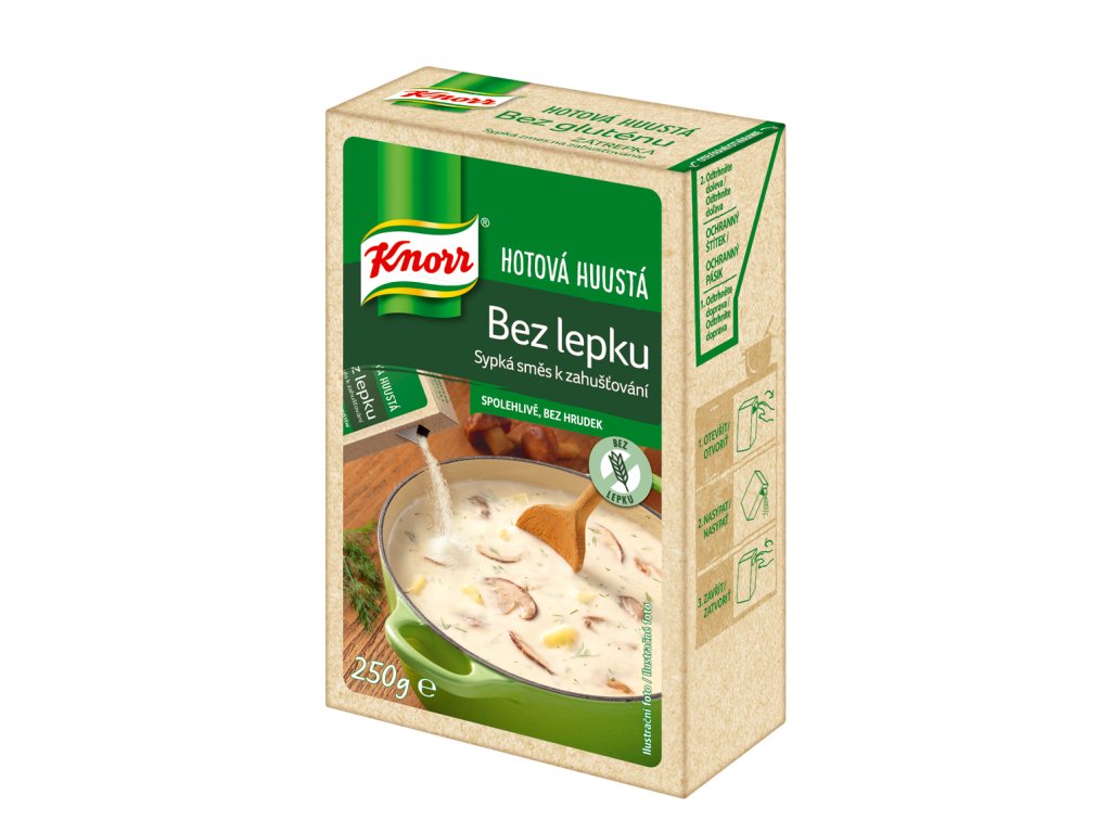 - Ochranný štítek1. Odtrhněte doprava2. Odtrhněte doleva1. Otevřít2. Nasypat3. ZavřítNávod na použití: Sypkou směs Knorr vsytpte do vroucí tekutiny. Dobře zamíchejte a asi 1 minutu povařte.Náš tip na dávkování: na 0,5l polévky či omáčky 4-6 polévkových lžic.Tip kuchaře: Polévka kulajda - viz foto přední strany výrobku.