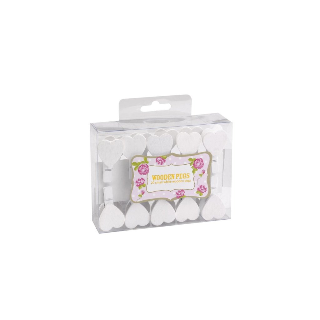 Svatební bílé dřevěné kolíčky. Tyto všestranné kolíčky s motivem srdíčka představují snadný způsob, jak vylepšit vaši svatební výzdobu. Použijte například pro přichycení menu na ubrousky nebo pro připevnění koordinačního štítku na stůl. Balení: 20 ksDoplňkové parametry