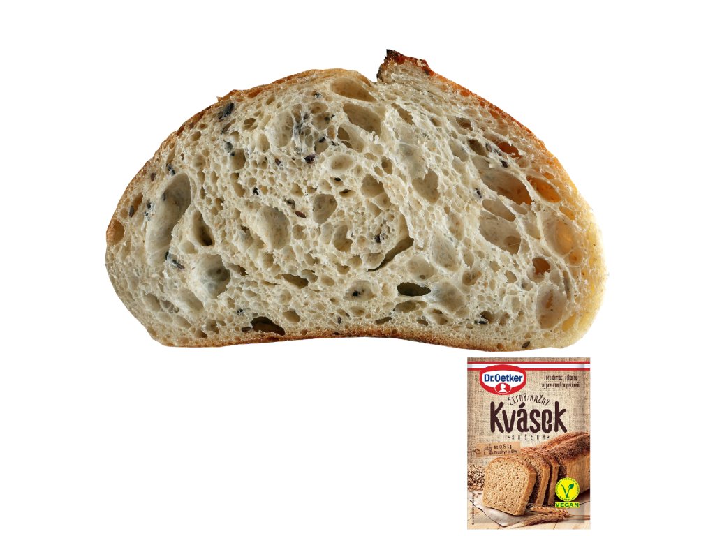 - Na pečení domácího kváskového chleba a pečiva, na 500g mouky. Domácí kváskový chléb: V míse smícháme 150g žitné mouky, 350g pšeničné hladké mouky, 1,5 kávové lžičky soli, 1 kávovou lžičku cukru, 1 balíček droždí Dr.Oetker a 1 balíček Kvásku Dr.Oetker. Postupně přidáváme 400ml vlažné vody, vypracujeme hladké těsto a důkladně prohnětemě. Těsto přikryjeme utěrkou a necháme na teplém místě vykynout asi 1 hodinu. Po vykynutí těsto ještě jednou propracujeme a přeneseme do formy (10 x 30 cm) vyložené papírem na pečení. Povrch potřeme vodou, můžeme posypat semínky, nebo kmínem a podélně nařízneme nožem. chléb necháme ještě 1 hodinu ve formě kynout. Vložíme do předehřáté trouby a pečeme 15 minut při 220°C. Poté ztlumíme teplotu na 190°C a pečeme dalších 30 minut. Chléb vyjmeme z trouby a necháme zcela vychladnout. Návod na oživení sušeného kvásku a zajímavé kváskové recepty najmete na www.oetker.cz.