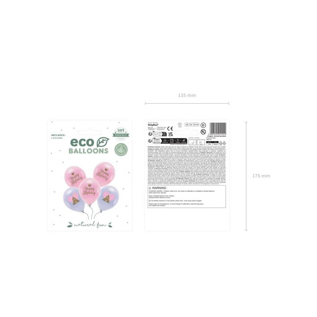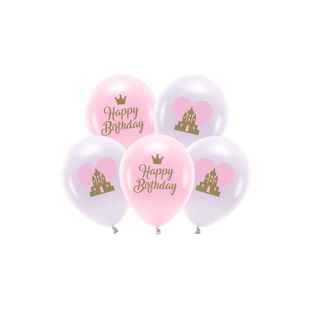 Sada obsahuje 5 růžových a fialových eco balónků s nápisem Happy Birthday.