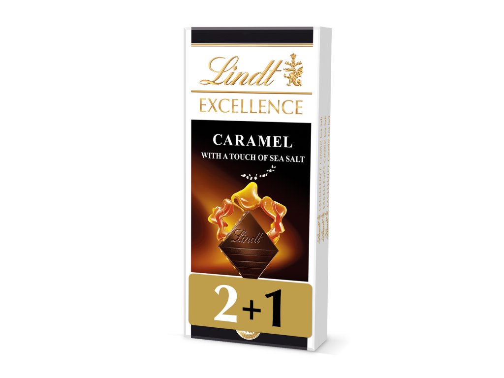 - Lindt Excellence Hořká čokoláda s křupavými kousky karamelu a mořskou solí