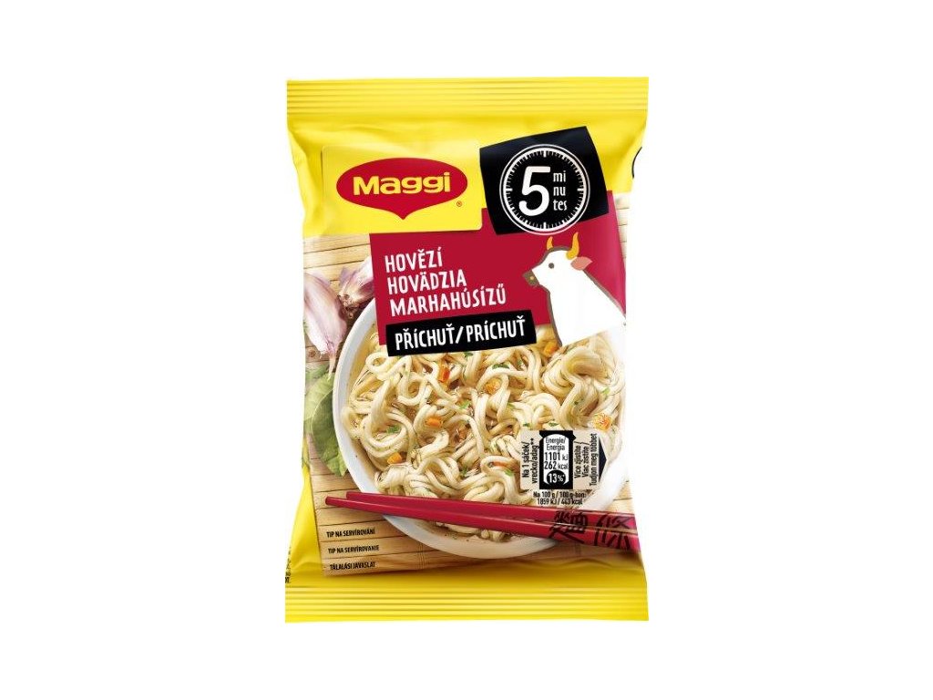 - MAGGI Nudle s hovězí příchutí. Instantní nudle s kořenícím přípravkem. Dehydrovaný výrobek.