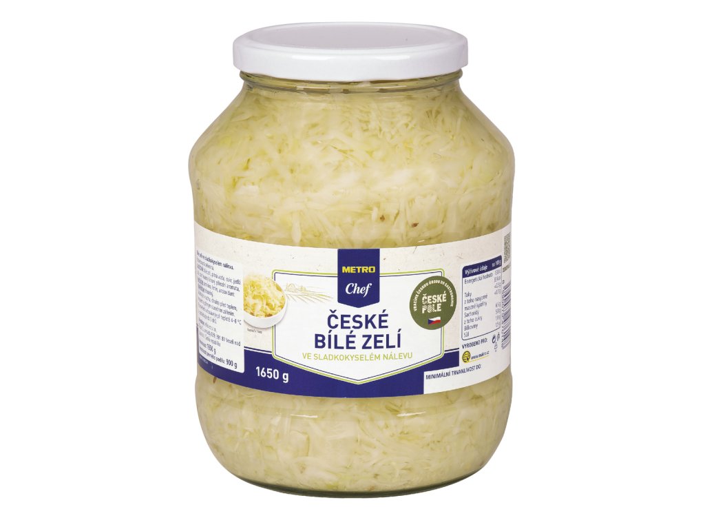 - bílé zelí, pitná voda, cukr, jedlá sůl, ocet kvasný lihový, přírodní aromata, HOŘČIČNÉ SEMÍNKO, kmín, antioxidant: DISIŘIČITAN DRASELNÝ.