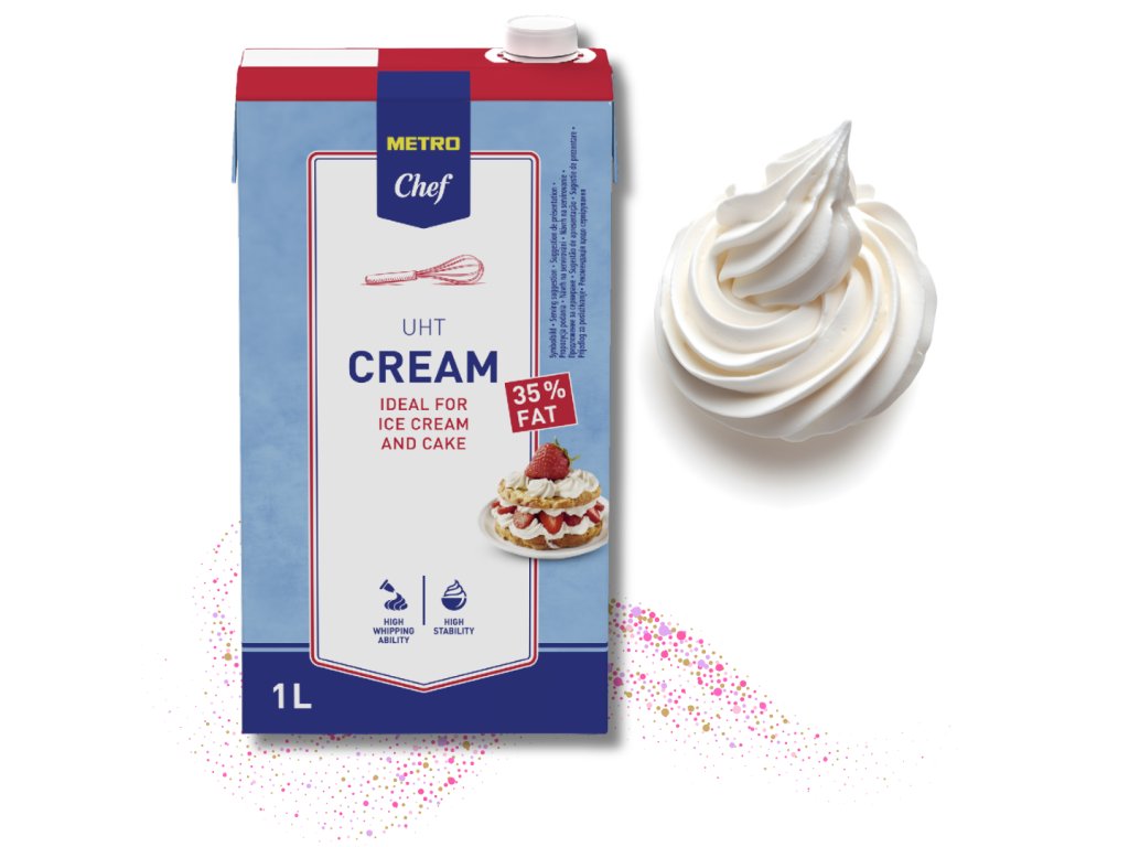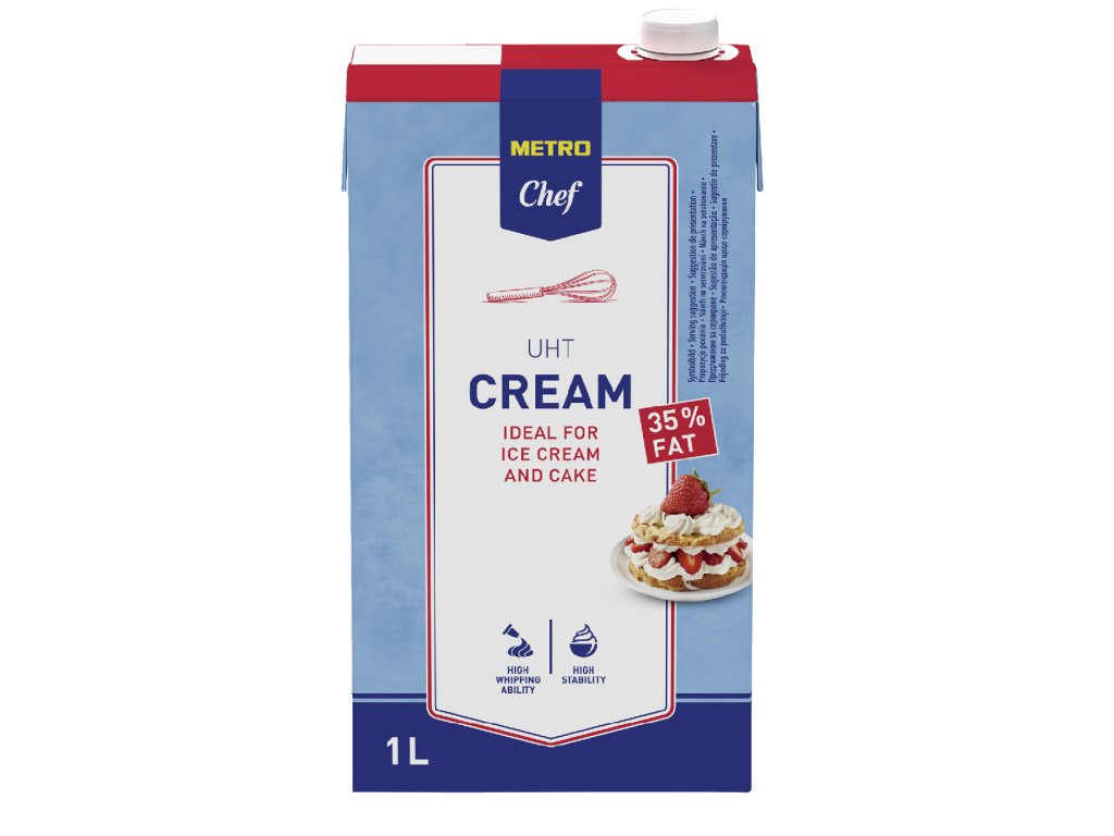 - Trvanlivá smetana ke šlehání, vysokotučná, min. 35 % tuku. Ošetřeno UHT záhřevem.