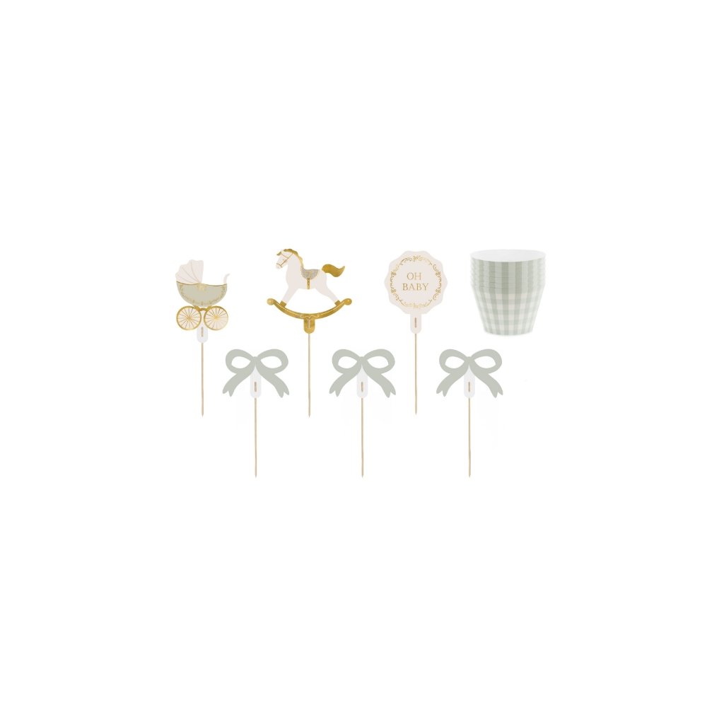 Dodejte svým muffinkám kouzelný vzhled díky této krásné muffinové sadě z kolekce Oh Baby. Pastelově zelené košíčky v jemném kostkovaném vzoru v kombinaci s elegantními zápichy v přírodních tónech tvoří dokonalou dekoraci pro baby shower, uvítání miminka nebo sladký bar na dětské oslavě. Sada obsahuje 6 papírových košíčků a 6 papírových zápichů na dřevěných špejlích – s motivem koníka, kočárku, mašliček a nápisu „Oh Baby“. Zápichy se snadno sestaví – stačí papírový tvar nasunout na připravený výřez na špejli. Ideální na výzdobu dortíků, cupcaků nebo muffinů – zkrášlí každý slavnostní stůl v jemném venkovském stylu. Technické parametry:Počet kusů v balení: 6 muffinových košíčků + 6 zápichůRozměry papírových prvků: cca 5,2–9 cmVýška špejle: 10 cmMateriál: Papír, dřevoBalení: 1 sada (6 ks)Doplňkové parametry