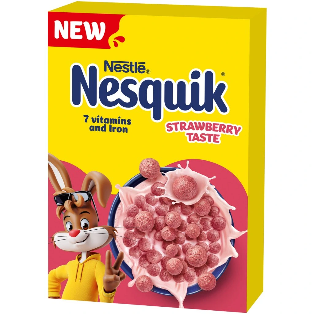 - Nestlé Nesquik jahodová příchuť – Cereální kuličky s příchutí jahod, s vitamíny a železem. Extrudovaný výrobek.