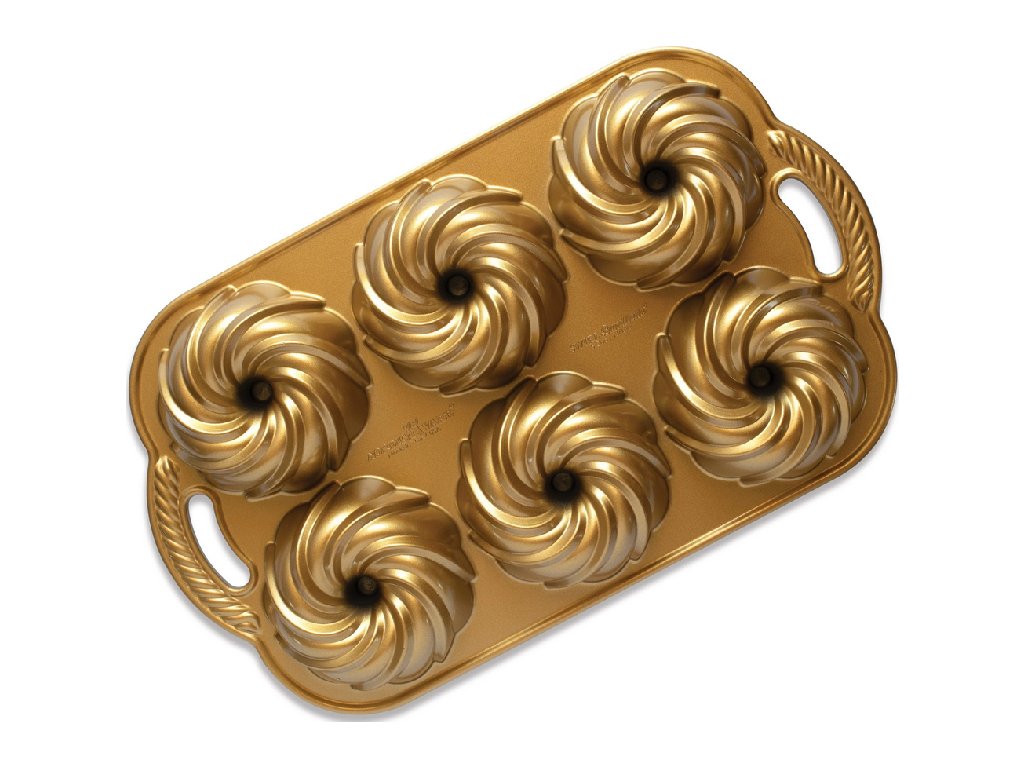Cukrářské potřeby a suroviny pro sladké pečení.Produkt pro domácí cukráře: NW Mini bábovky Vodní vír plát se 6 formičkami 3 cup zlatá ,