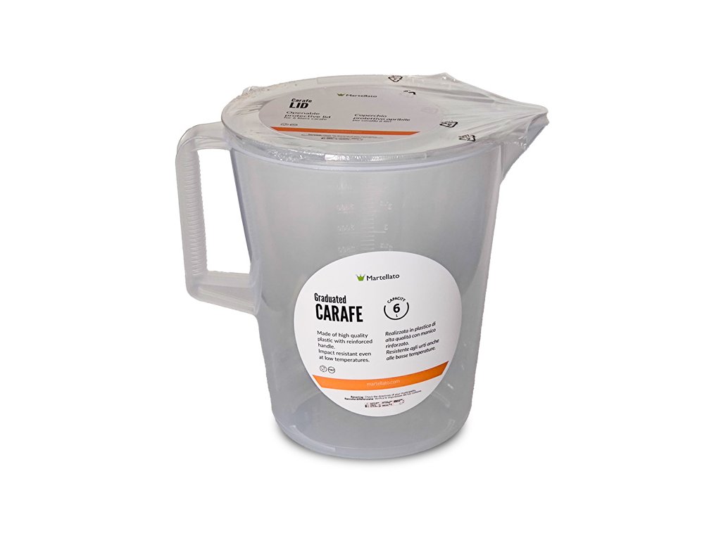 Profesionální plastová karafa MAXI, s objemem 6000ml. Průhledná s odjímatelným uzávěrem, stupnicí a zesíleným úchytem.