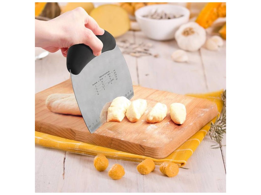 Karta z Vás rázem udělá profesionální kuchaře. S její pomocí snadno přemístíte nakrájenou zeleninu do pánve, dokonale vyčistíte kuchyňské prkénko, pomůže Vám rychle rozsekat i vařenou zeleninu nebo vajíčka, rozdělit těsto. Můžete ji využít i při vaření halušek, různých zavářek do polévek a při zpracování těsta. Na hraně vyznačeny jednotky délky v cm (0 až 14,7 cm), na jedné straně vyznačeny převody měrných jednotek (hrnek-fl oz-lžíce-ml). Materiál: nerez, guma, plast Rozměr: 12 x 16 cmDoplňkové parametry
