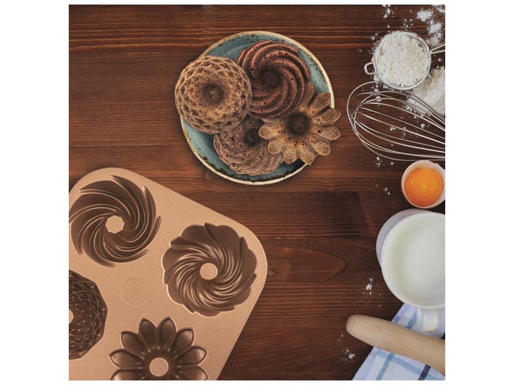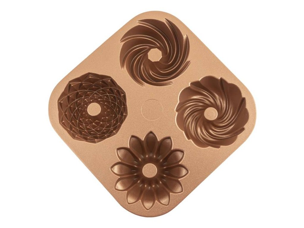 Forma na 4 mini bábovky s nepřilnavým povrchem PFLUON pro pečení piškotových, třených i kynutých těst, slaných dezertů, na přípravu pudinků, aspiků, paštik i jiných slaných dobrot. Je odolná teplotám do +200 °C. Formu klasicky vymažte a vysypte moukou a skvěle ji pak z formy vyklopíte. Vhodná do elektrické, plynové i horkovzdušné trouby. Snadno se umývá, nelze ji umývat v myčce na nádobí. Materiál: hliník s povrchovou úpravou v barvě mědi – uvnitř dvojitý nepřilnavý povrch, vně nástřik- měděný efekt, úprava PTFE Průměr 1 bábovky: 10 cm Výška: 4,5 cmDoplňkové parametry