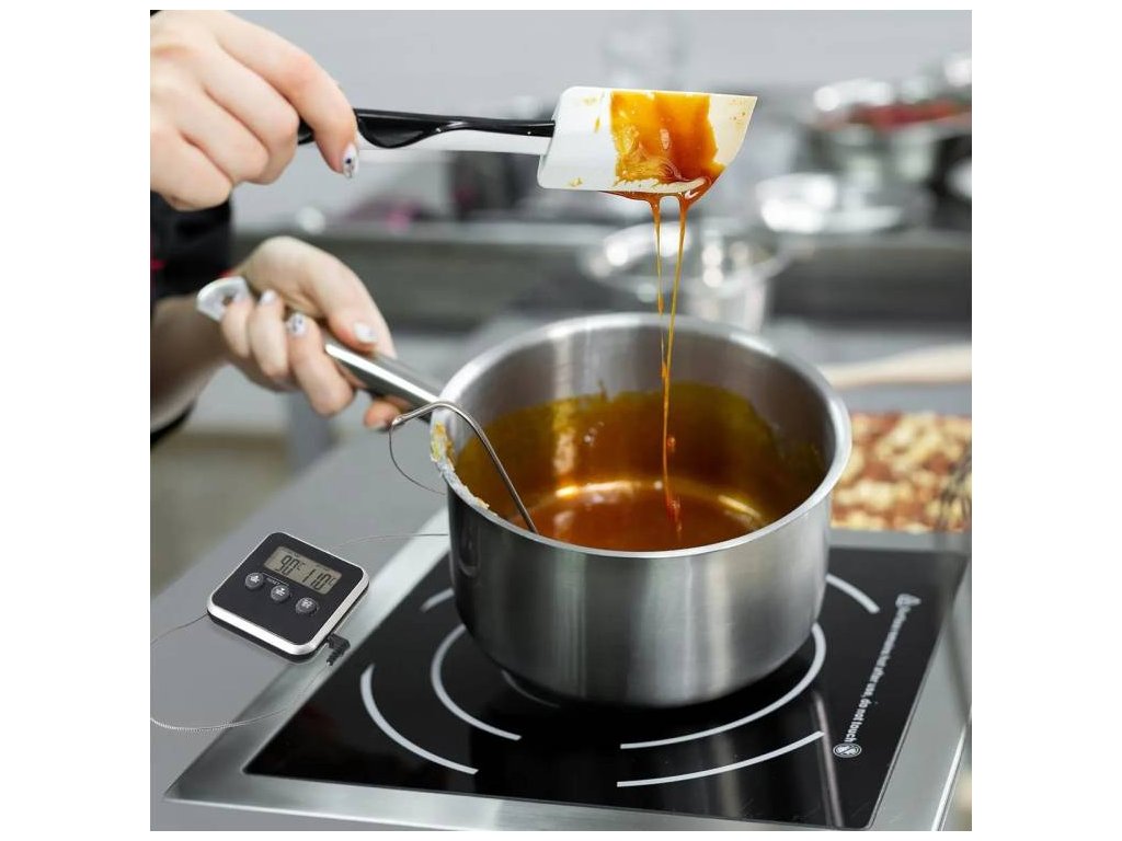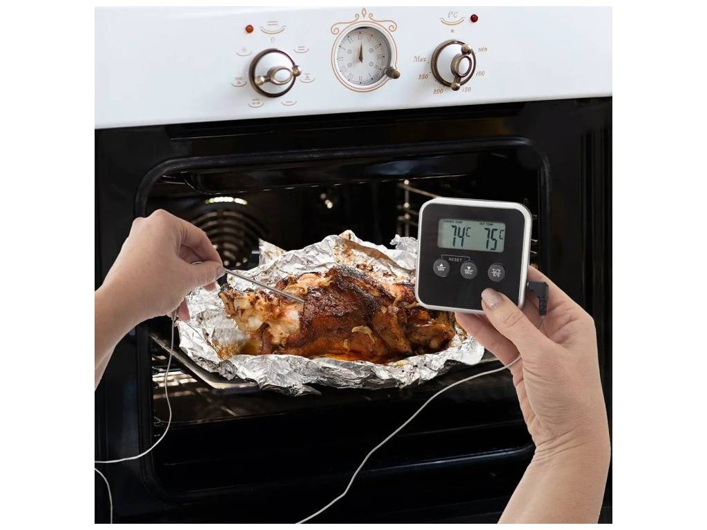 Kuchyňský digitální teploměr se sondou a kuchyňská minutka v jednom je skvělý pomocník nejen při přípravě masa. Využít jej můžete při grilování, pečení masa v troubě, při uzení v udírně, chlazení potravin v lednici, při vaření džemů, sirupů, karamelu apod. Vlastní tělo teploměru z ABS plastu je doplněno kovovým lankem o délce 93 cm, na jehož konci je 16 cm jehla s hrotem z nerezu s/s 304. Tento senzor měří teplotu hluboko uvnitř. Ať už pečete velký kusa hovězího masa, např. nízký roštěnec, vepřovou pečeni, roastbeef nebo jehněčí. teploměr umožňuje nastavit teplotní alarm při dosažení požadované teploty, jakmile teplota pokrmu dosáhne zvolené teploty, ozve se zvukový signál můžete zvolit režim minutky, které klasicky odpočítá nastavený čas a o jeho konci vás informuje zvukový signál možnost nastavení jednotky teploty v °C nebo v °F rozsah měření teploty od -20 °C do +300 °C rozsah časovače 99 min 59 sec Možnost zavěšení, postavení pomocí stojánku nebo přichycení magnetem na zadní straně teploměru. To využijete v momentě, kdy nepotřebujete jednorázově kontrolovat aktuální teplotu, ale teploměr umístíte na přední, kovovou plochu trouby. Lanko se senzorem zapíchnete do masa a necháte jej uvnitř troubyza zavřenými dvířky. Klidně po celou dobu pečení. Návod je součástí výrobku. Přepínač časovače a měření teploty najdete na zadní straně teploměru (COOK/TIMER). Napájení 1x 1,5V AAA baterie (není součástí). Rozměr: 8 x 8 cmDoplňkové parametry