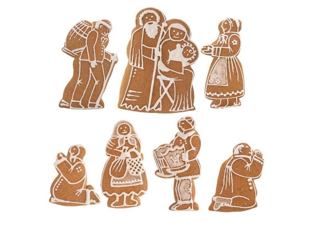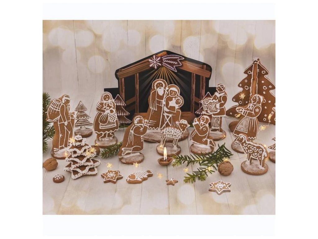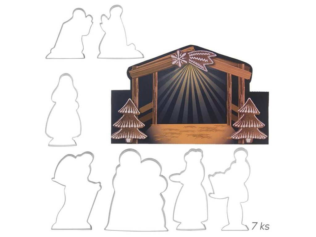 Sada vykrajovaček vám umožní vytvořit si doma voňavou dekoraci pro vánoční období. Sada obsahuje 7 základních figurek. Součástí balení je recept a také papírové jesličky/chlév, které můžete využít pro dokonalé sestavení Betlému. Materiál: nerez Výška figurek: 7 - 12 cmDoplňkové parametry