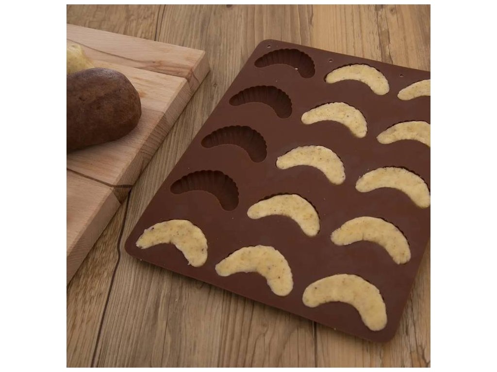 Pečte tradičně, ale v netradičních formách bez pracného vyklepávání jednotlivých kousků. Křehké vanilkové, čokoládové, šlehačkové, polomáčené i slepované rohlíčky ze silikonové formy v hnědé barvě budou o svátcích obzvláště vypečené. A jeden jako druhý. Díky kvalitní a praktické silikonové formě bude i vaše letošní pečení cukroví snadnější. Třeba 15 rohlíčků délky 5,5 cm naráz. Formy jsou vyrobené z odolného, žáruvzdorného silikonu, určeného pro styk s potravinami. Lze je použít i na čokoládové pralinky nebo želatinové bonbóny. Materiál: silikon - odolný vůči teplotám -40 °C až +220 °C Rozměry: 24,5 x 21 x 1,2 cmDoplňkové parametry