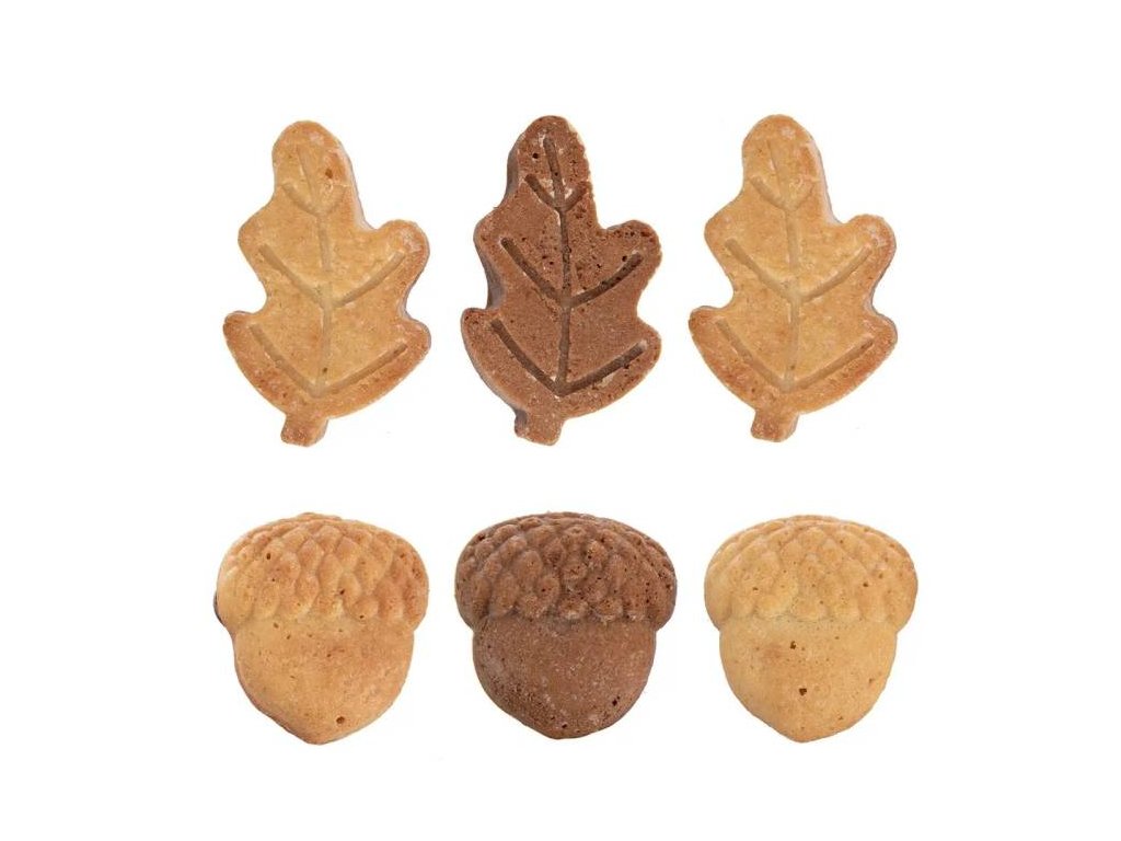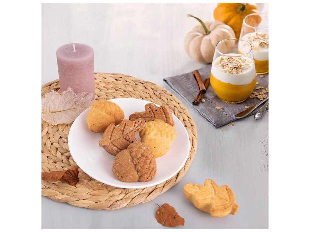 Pečte tradičně, ale v netradičních nepřilnavých formách. Podzimní pečení v tematických tvarech bude jednodušší díky pružné formě. Listy či žaludy z litého nebo piškotového těsta, zdobené polevou či posypem, jsou oblíbeným dezertem k odpolednímu čaji. Hodí se i na přípravu malých cheesecaků, panna cotty i domácí paštiky. Nebo na zajímavý pudink se sezónním ovocem. Rozměry: 27 x 17 x 3,5 cm Rozměr jednoho tvaru: 8,5 x 6,5 cmDoplňkové parametry