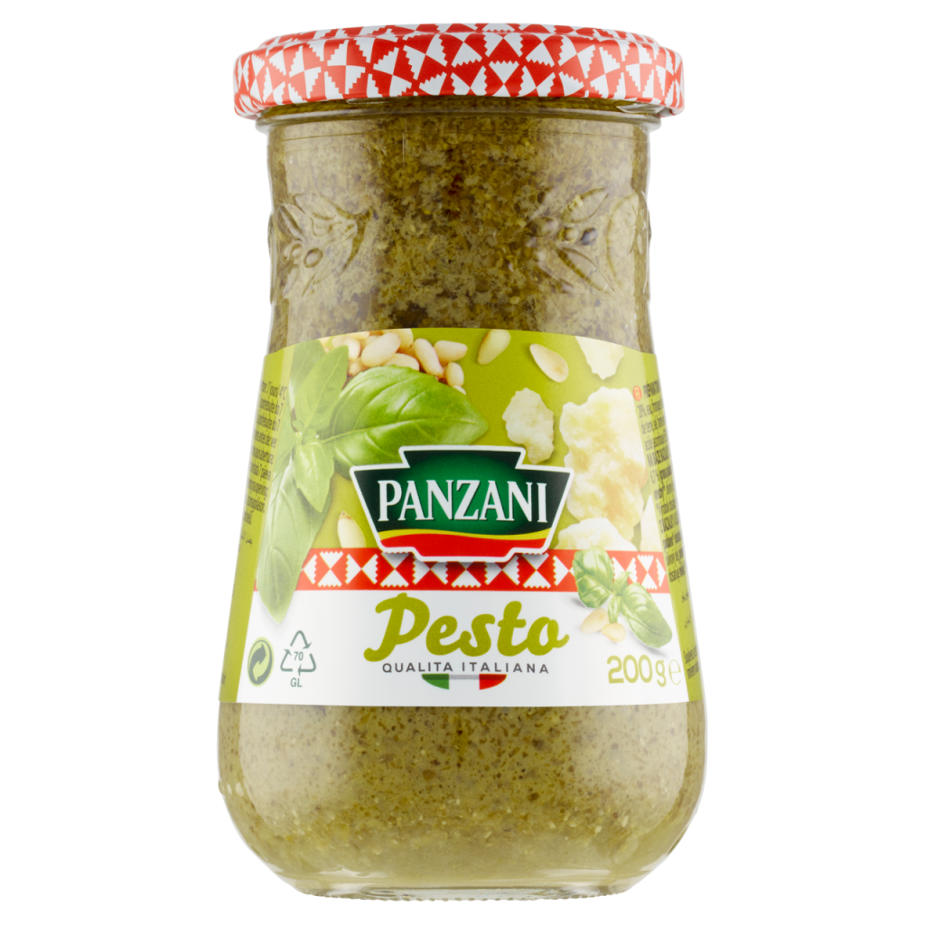 - Bazalka 33%, slunečnicový olej 28%, voda, italské sýry 6,7% (grana padano (obsahuje lysozym z vajec), sýr z ovčího mléka), glukózový sirup, bramborové vločky, jedlá sůl, kešu oříšky, olivový olej, piniové očíšky 0,5%, regulátor kyselosti: kyselina mléčná, antioxidant: kyselina askorbová, česnek