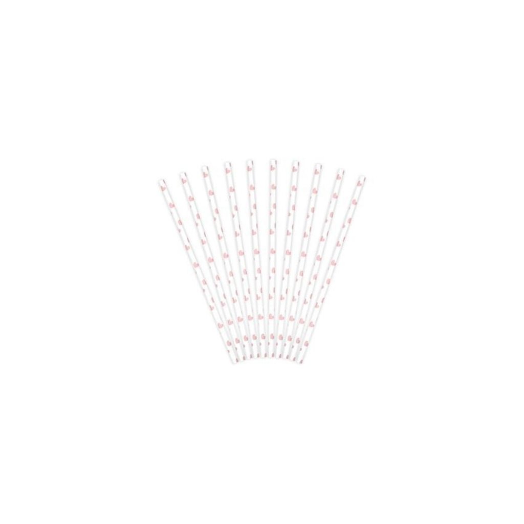 Papírová brčka bílá - růžová srdíčka - 10 ks /BP