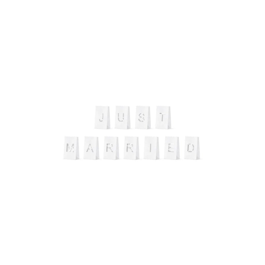 Papírové dekorační pytlíčky - Just Married, vhodné k osvětlení svíčkou nebo Led světélky. Pytlíčky jsou perforované aby vynikl nápis Just Married. Krásná světelná dekorace, která se bude hodit na jakoukoliv svatbu. Balení: 11 pytlíčkůDoplňkové parametry