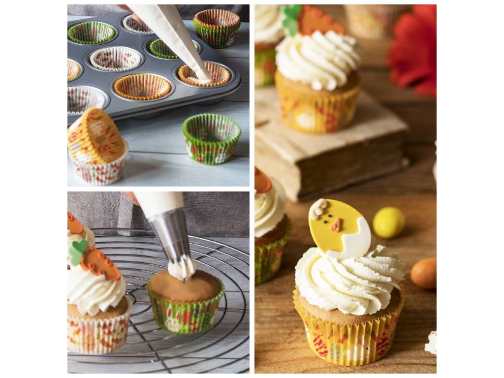 Cukrářské potřeby a suroviny pro sladké pečení.Produkt pro domácí cukráře: Papírové košíčky na muffiny 36ks velikonoční zajíček, vajíčka a mrkvička - Decora ,