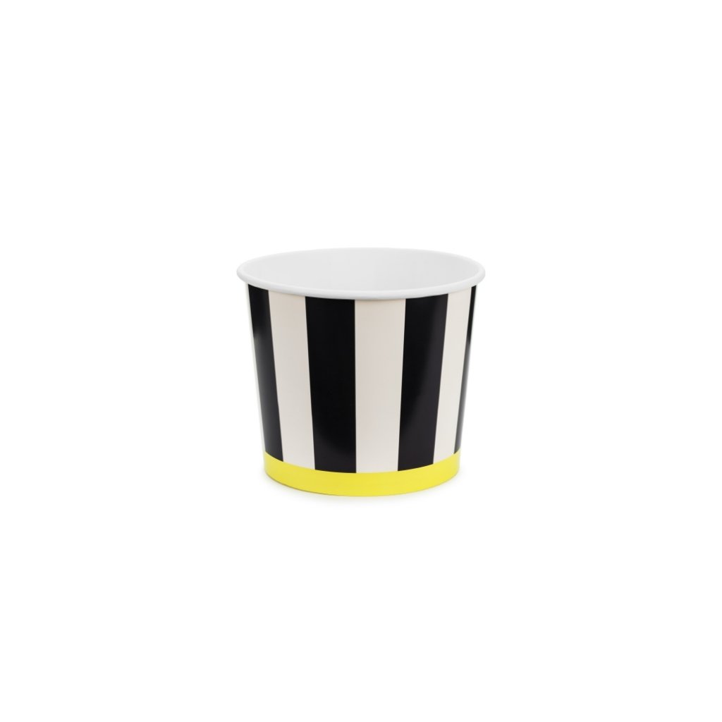 Papírové snack kyblíky v moderním pruhovaném designu jsou nejen praktické, ale i výrazným doplňkem každé párty. Skvěle se hodí na popcorn, preclíky, bonbony nebo kousky ovoce – jednoduše na vše, co se na oslavě hodí podávat stylově a pohodlně. Černobílý pruhovaný vzor s výrazným žlutým lemem se hodí jak na dětské fotbalové party, filmové večery, tak i na tematické zahradní slavnosti. Materiál: PapírVýška: 14 cmPrůměr: 13–16,5 cmBarva: Černobílé pruhy se žlutým spodním lememBalení: 2 ksDoplňkové parametry