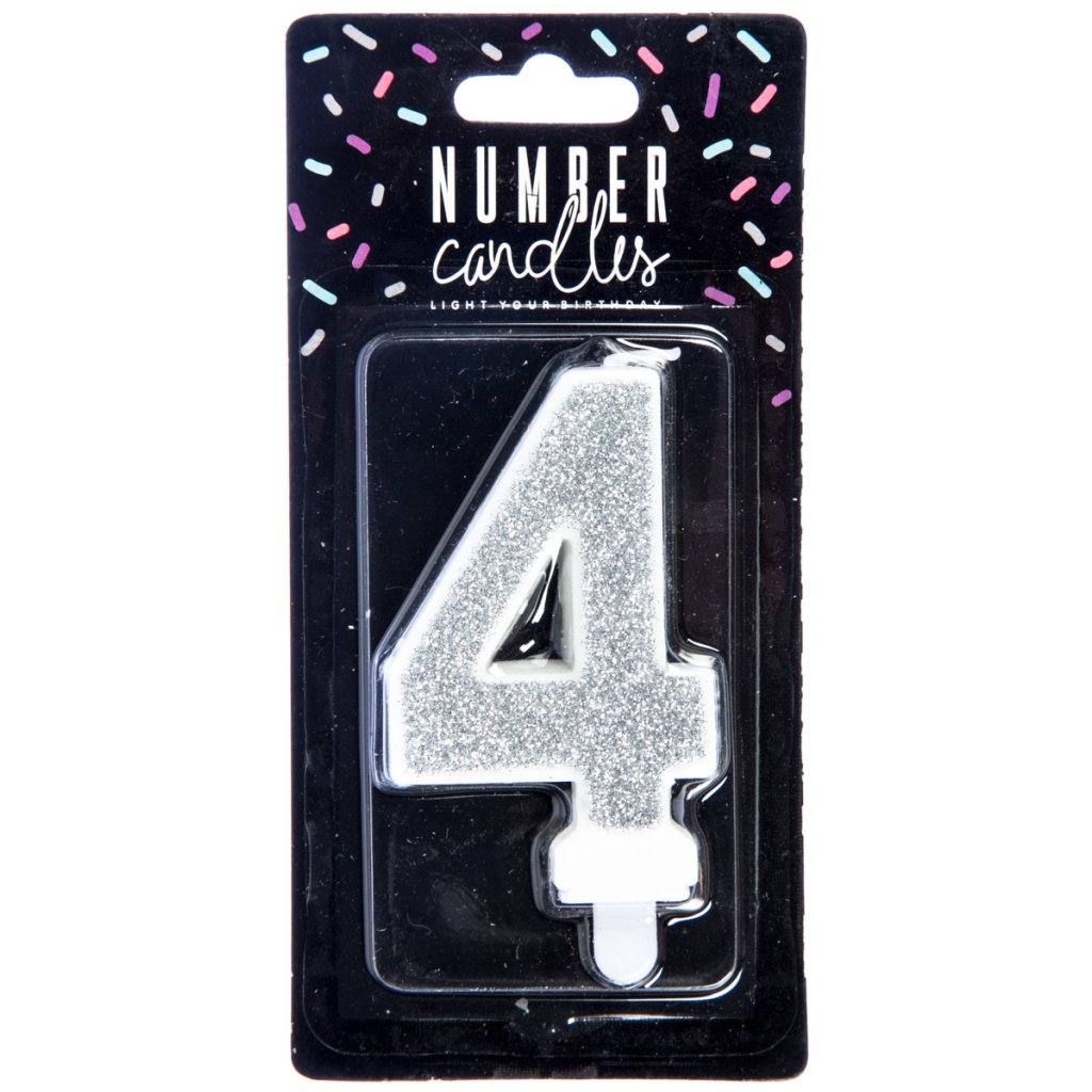 PartyDeco svíčka malá stříbrná číslo 4 ▹